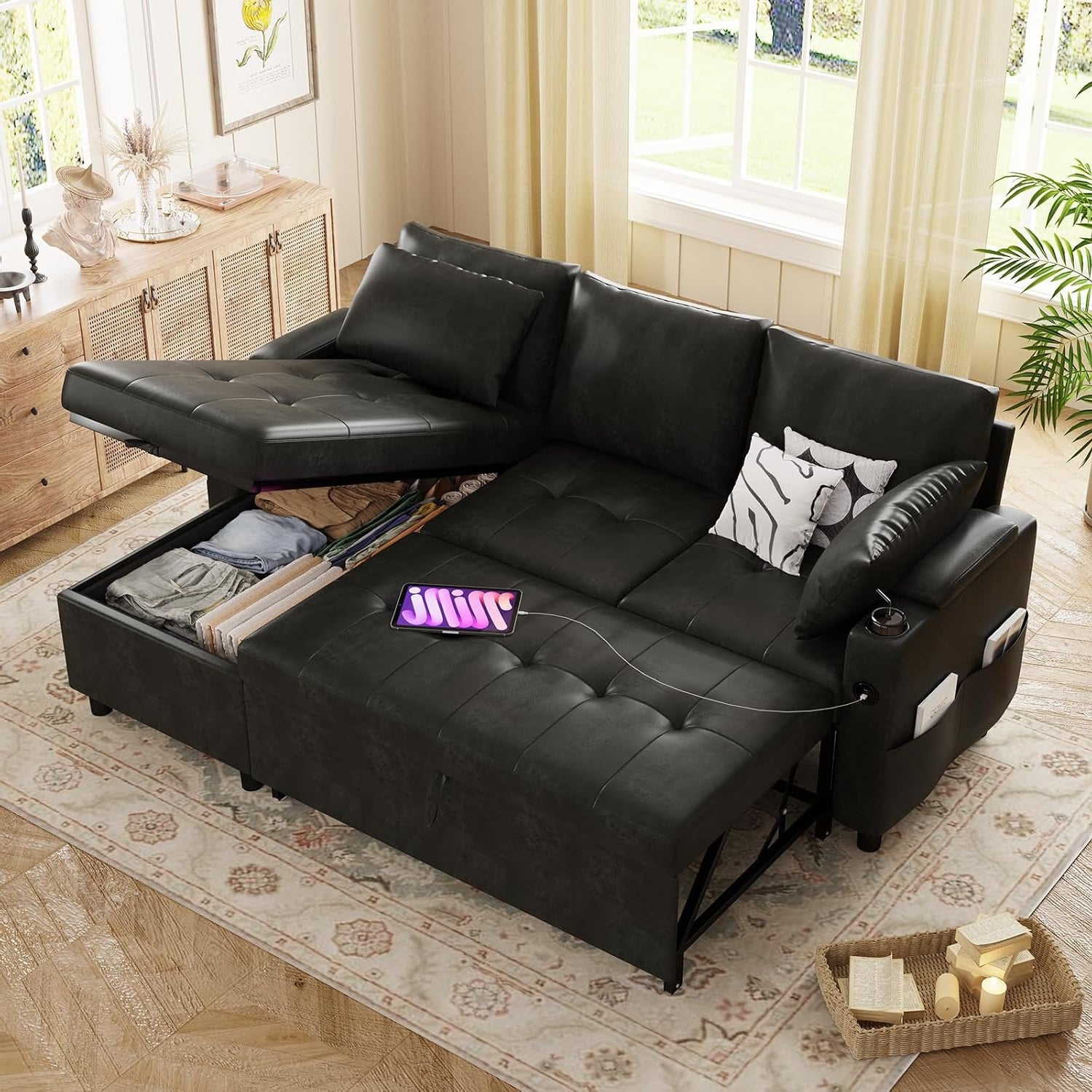 YODOLLA Faux Leather L-Shaped Sleeper Sofa, Pullout Bed, USB & Storage, Black