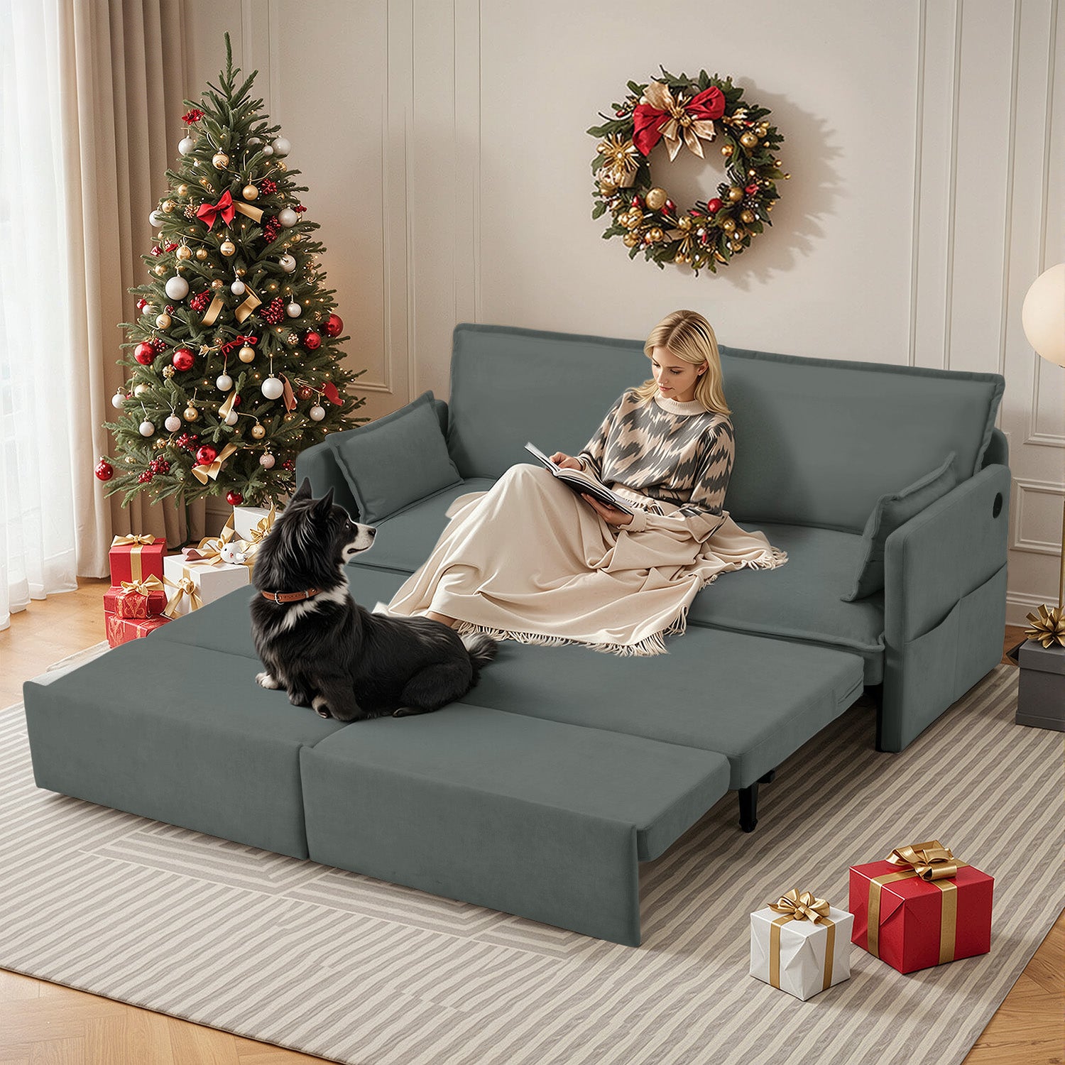 YODOLLA L-Shaped Sleeper Sofa, Pullout Bed, USB & Storage, Grey