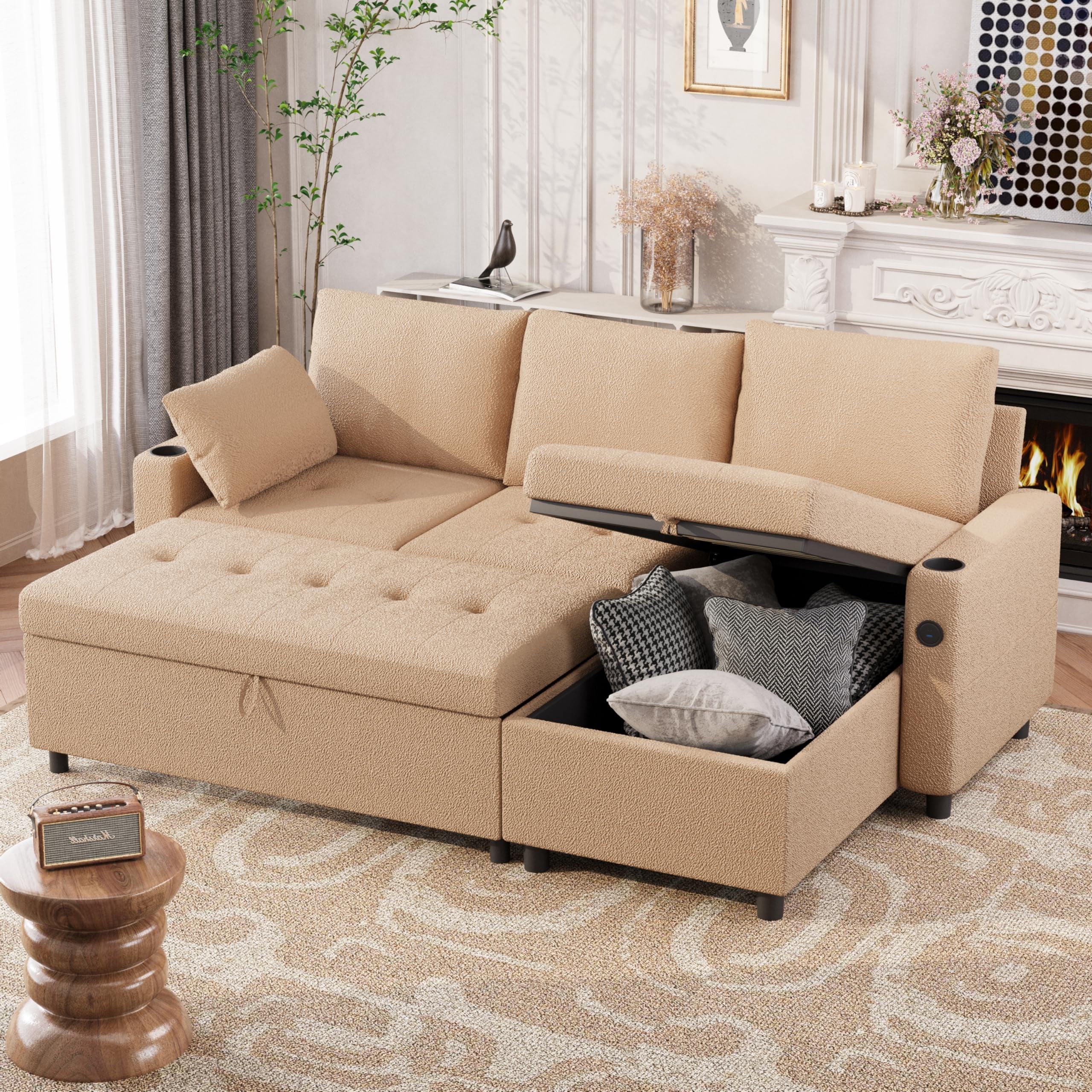 YODOLLA 83.5" Teddy Fleece Sleeper Sofa Sectional Sofa Bed Couches, Beige