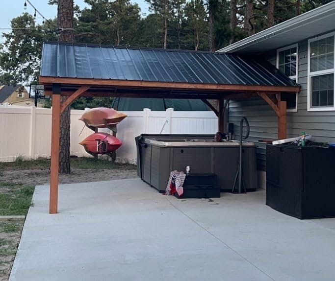 This wooden gazebo is my backyard's best addition.The insulated roof blocks heat and rain,and it fits so well with my garden plants.My outdoor hangs got way better.