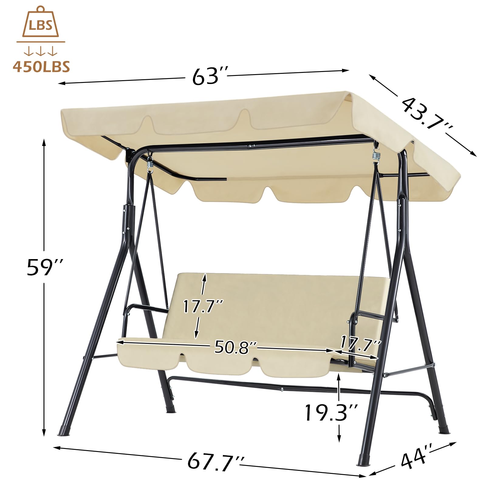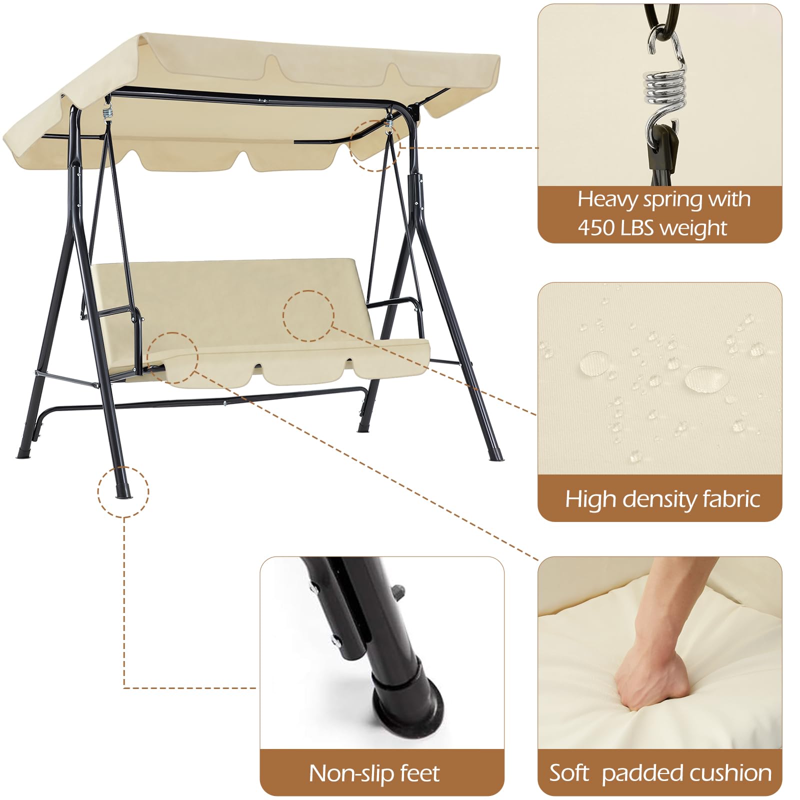 • DURABLE & STURDY CONSTRUCTION: Constructed with weather resistant powder coated steel frame, the canopy swing chair is made of high-density fabric. Heavy spring structure connects the swing to the frame to make a smooth and gentle rocking motion, holding up to 450lbs.