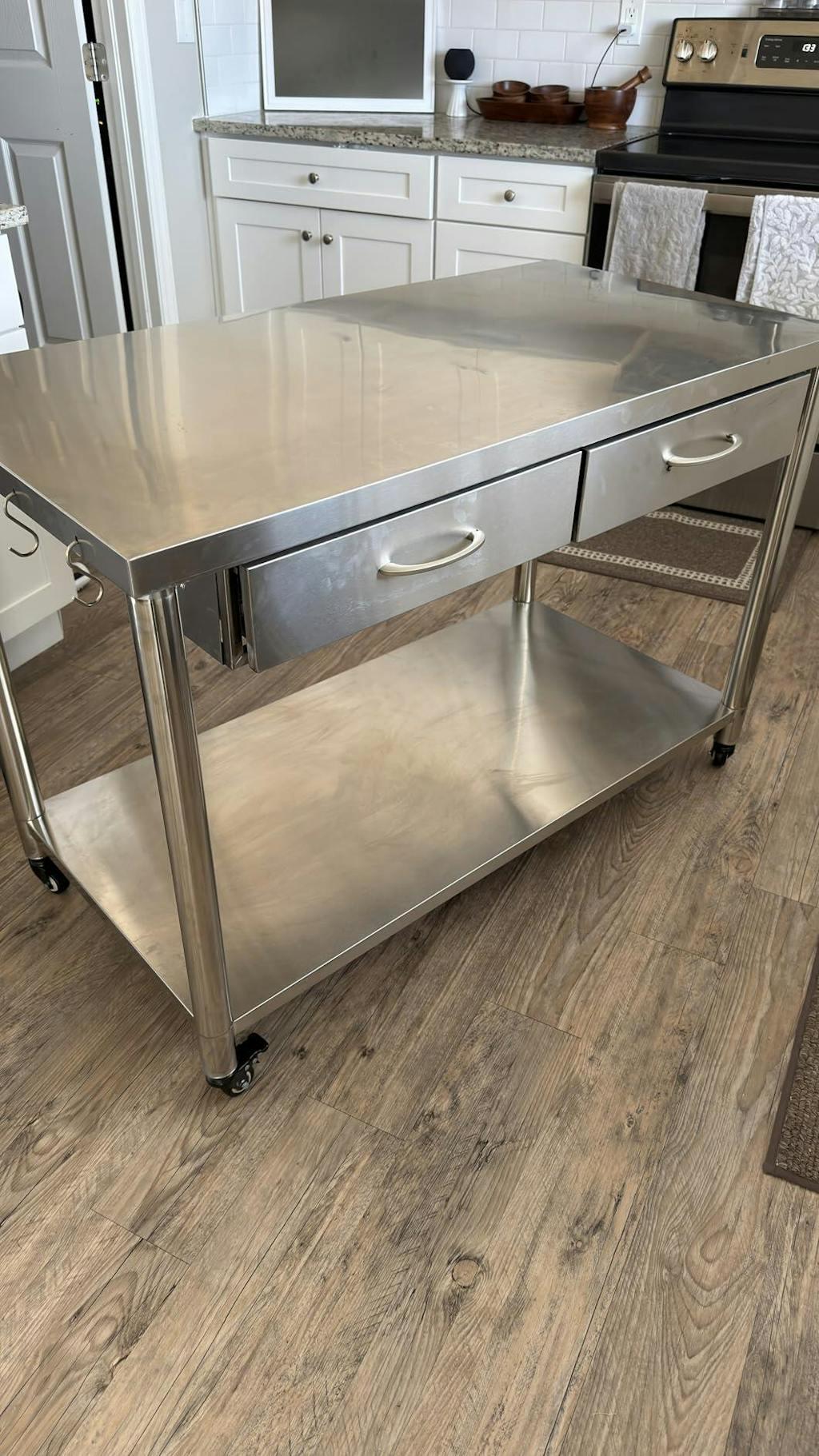 The YODOLLA Stainless Steel Work Table is a versatile, multi-purpose solution for both commercial and home environments. With a high load capacity of 840 lbs, it features 2 drawers, 1 bottom shelf, and 4 rotating wheels (including two lockable). Constructed from durable, rust-resistant stainless steel, this workbench is perfect for kitchens, workshops, or prep stations. Its easy-to-clean surface ensures low maintenance, while simple assembly makes setup quick. Ideal for heavy tools, appliances, and food supplies, this practical table combines reliability with convenience.