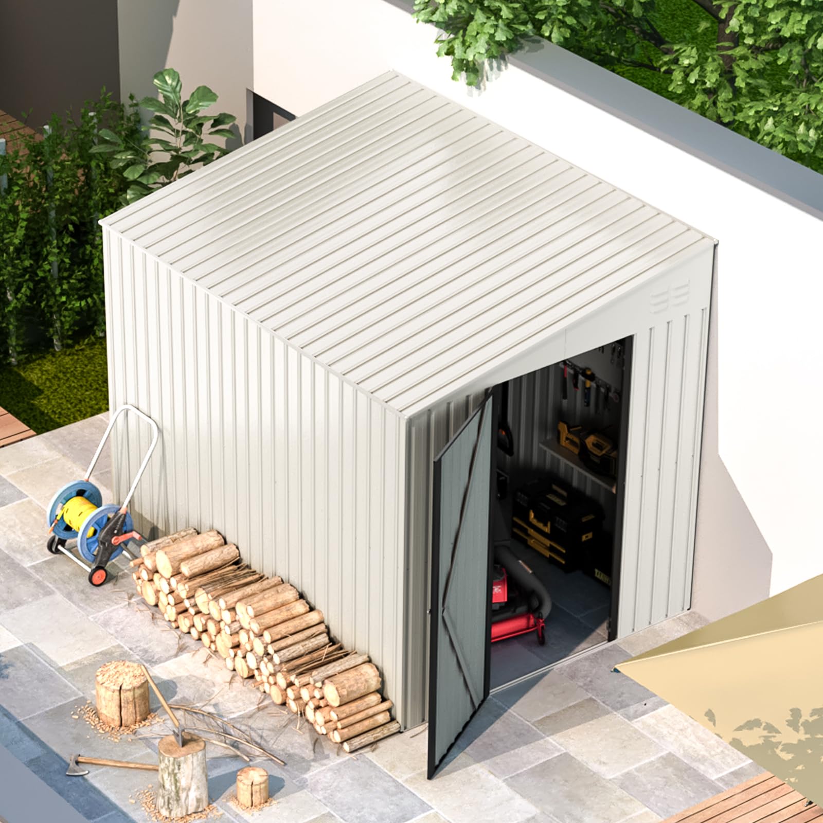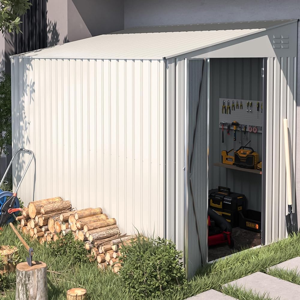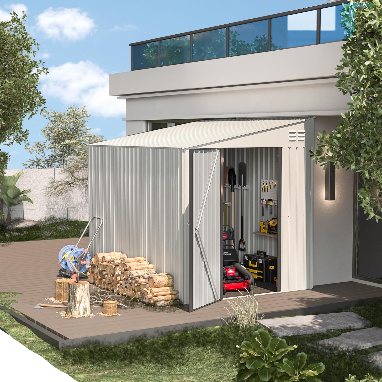 The YODOLLA Outdoor 6' x 8' Metal Wall Side Lean-to Storage Shed in white is the perfect solution for your backyard storage sheds. With a 48 Sq. Ft footprint and a 2.3' door, this 8x6 shed offers plenty of space to store 8 lawnmowers, 12 bikes, 8 snowmobiles, or 3 Vespa motorcycles. Ideal as a small storage shed, it provides versatile storage for all your outdoor equipment. The galvanized coating ensures resistance to rust, oxidation, and moisture, while the sloped roof prevents water pooling, making this lean to shed highly durable in all weather conditions. Weighing 143 lbs, it offers excellent stability and wind resistance up to 70 mph, ensuring your items are protected. Whether you're looking for a white shed or metal garden sheds, this reliable option is designed for long-lasting performance. Our customer-friendly assistance is available anytime to help with your storage needs.