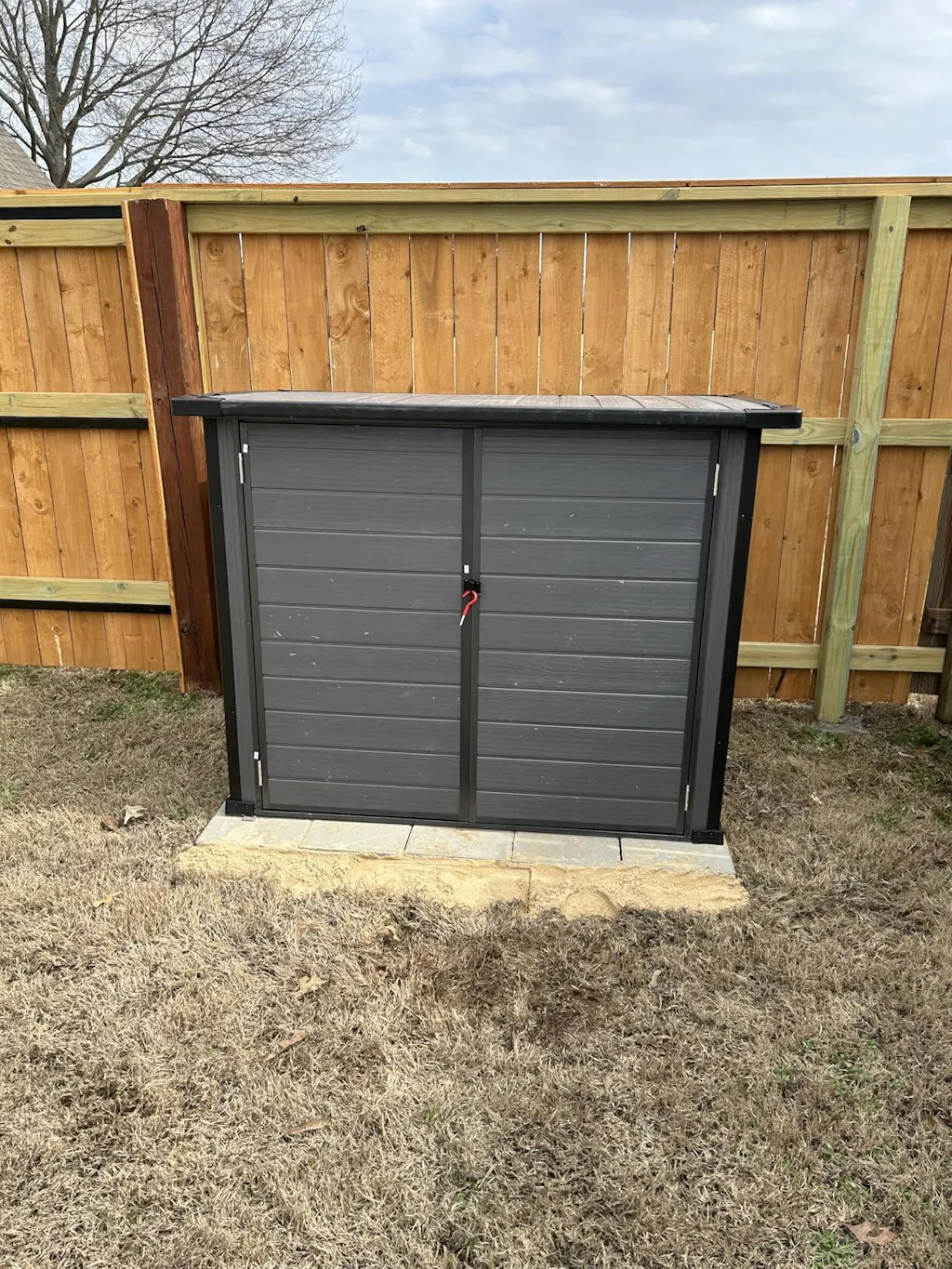 This storage shed is perfect for keeping our trash bins out of sight. It's sturdy and easy to use. The material is weatherproof, so I don't have to worry about it getting damaged.