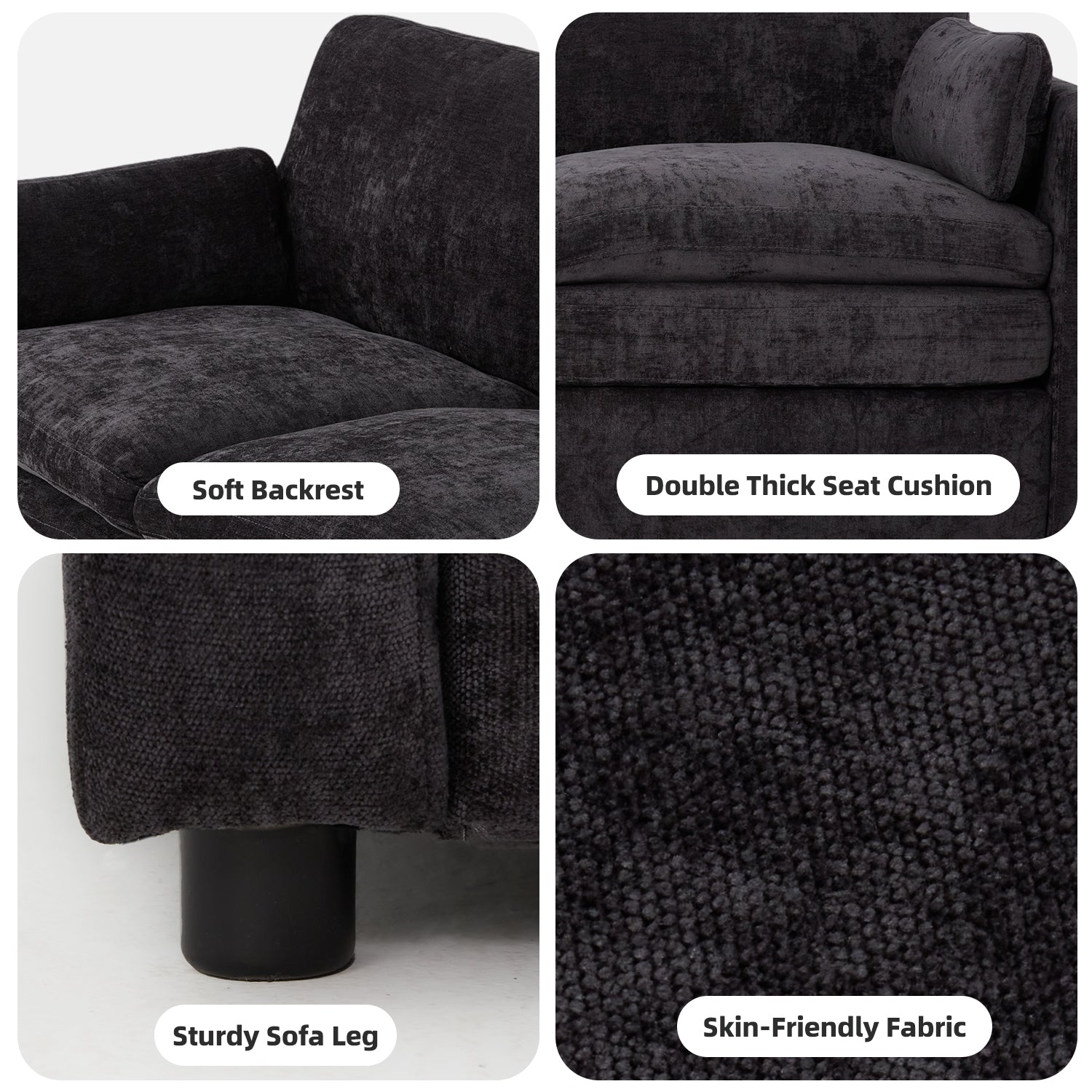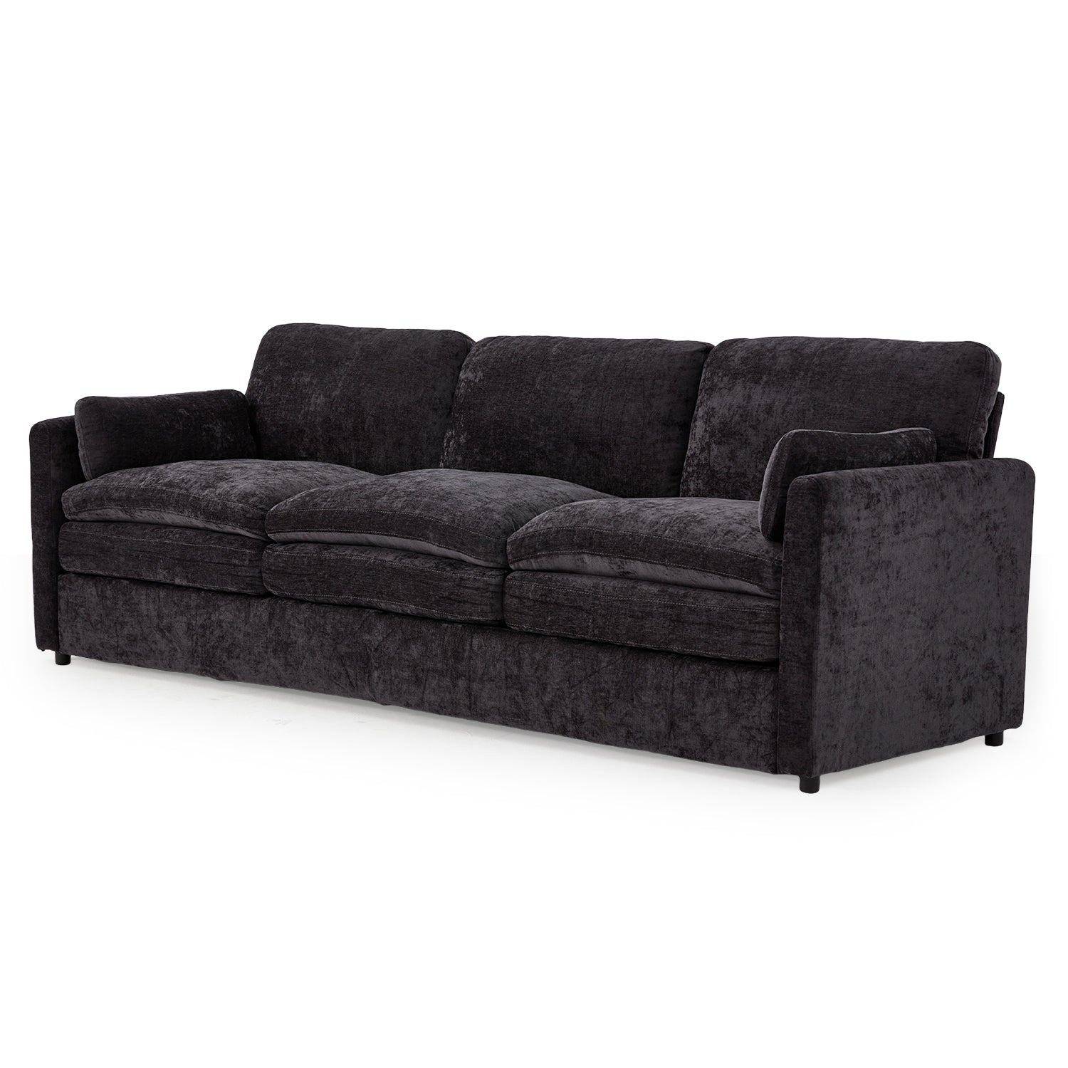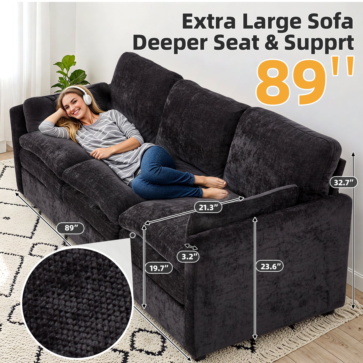 Experience effortless comfort and modern convenience with this 89" chenille living room sofa, designed for quick assembly, lasting support, and everyday relaxation. Built with a no-screws structure and delivered in one box, it can be assembled in under 15 minutes, making it perfect for apartments, small spaces, and busy households. The extra-large 89-inch size provides plenty of room for naps, reading, movies, or cozy lounging, while the two-layer 22" deep seat cushions offer both softness and firmness so you never feel like you’re sinking. Ergonomically curved for full-body support, this modern couch includes two removable pillows for added comfort. The breathable chenille fabric adds stylish texture and durability, and the sturdy frame supports up to 800 lbs, making it an ideal choice for families seeking a reliable, comfortable, and stylish modern sofa.FAQ