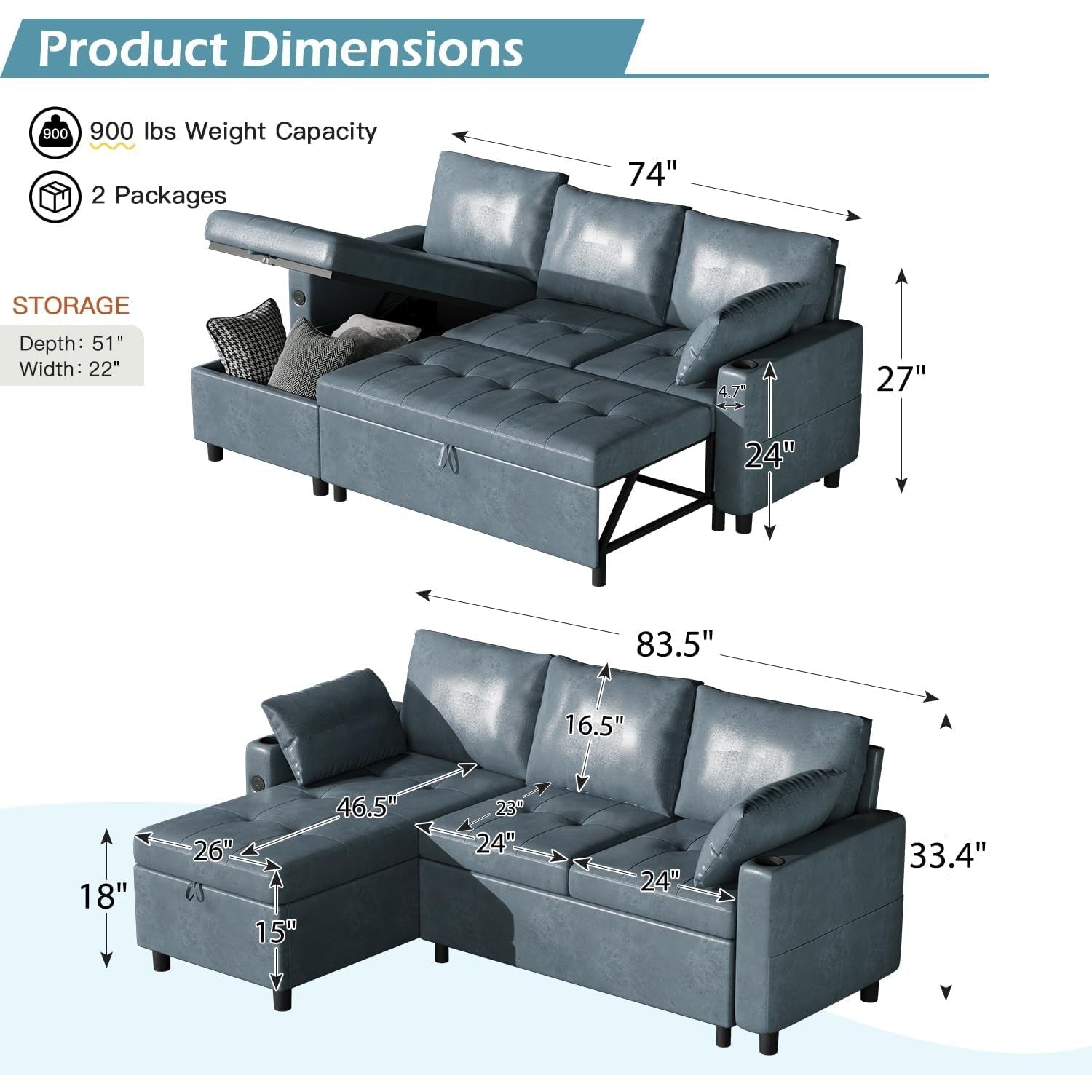 YODOLLA Faux Leather L-Shaped Sleeper Sofa, Pullout Bed, USB & Storage, Blue