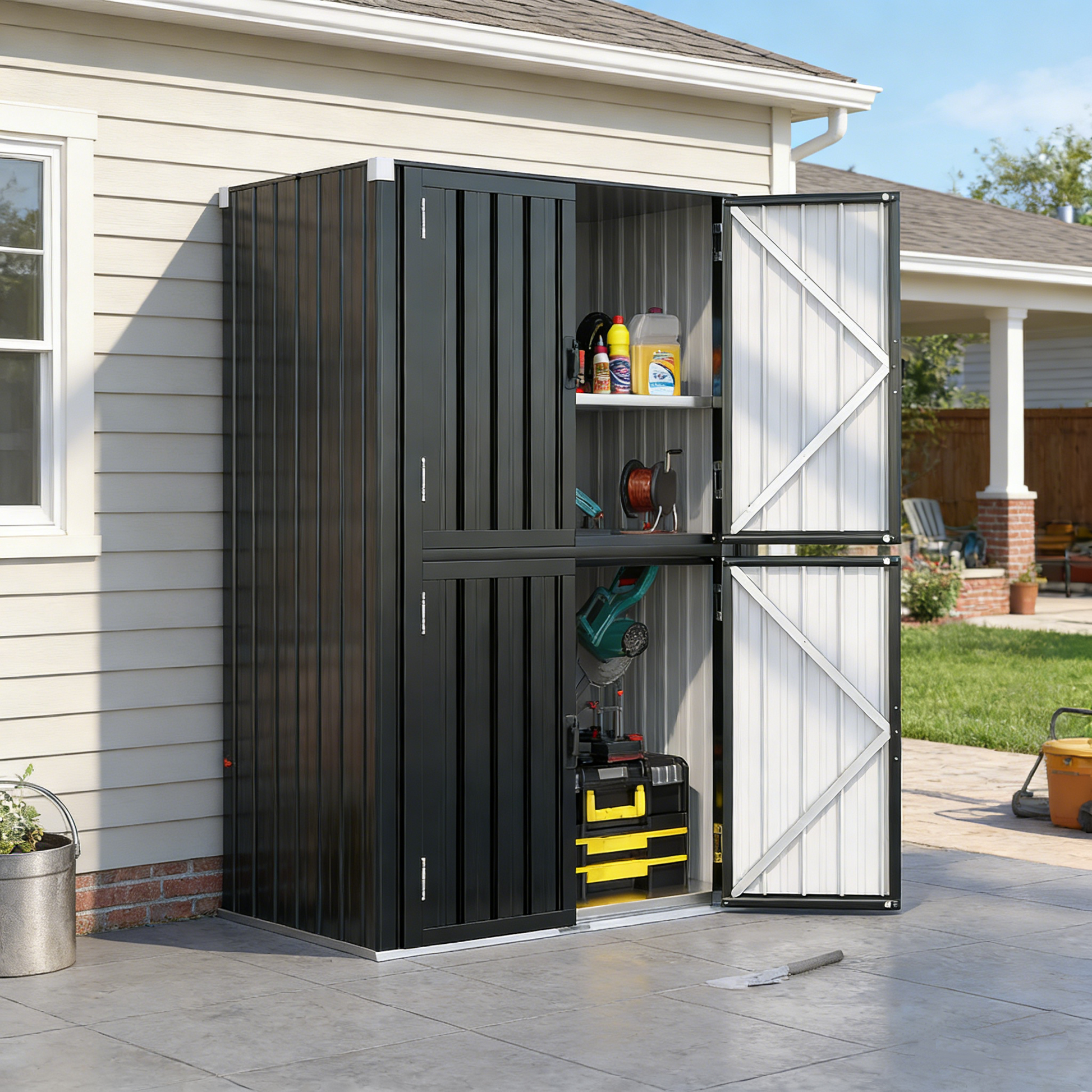 • Adjustable 3-Tier Shelves: This storage shed features three finely crafted, adjustable-height shelves, perfect for storing a variety of items, from outdoor and garden tools to other large, heavy objects and indoor essentials. Its flexibility allows for personalized, precise organization.